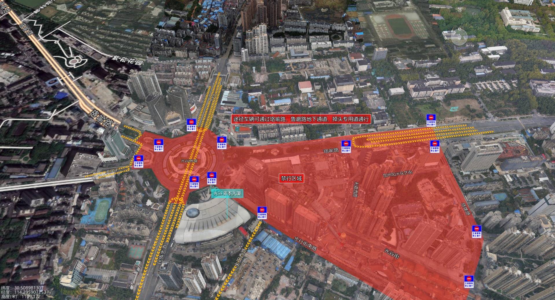 1.需通行光谷星河广场区域的车辆,可通过:鲁磨路、珞喻路地下通道绕行;前往光谷环岛方向车辆可绕行雄楚高架、雄楚大道、紫菘花园路、邮科园路、楚韵路、卓刀泉南路;